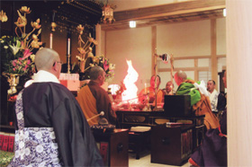 護摩壇(ごまだん)に火を点じ、火中に供物を投じ、添護摩木(添え木に名前や年齢、祈願したいことを書いて納めて頂いたもの)を投じて祈願します。