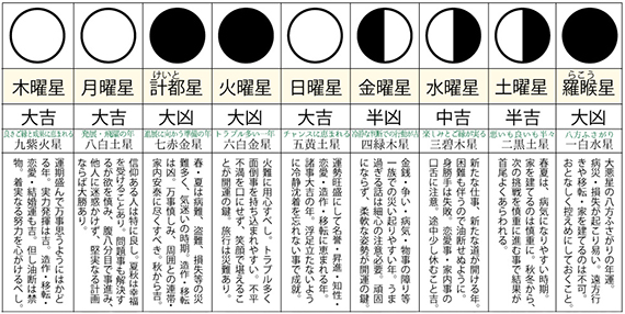 九年ごとに九曜が循環しており、自分の生まれ年(かぞえ年)を見ると、今年はどの星に当っているかがわかります。